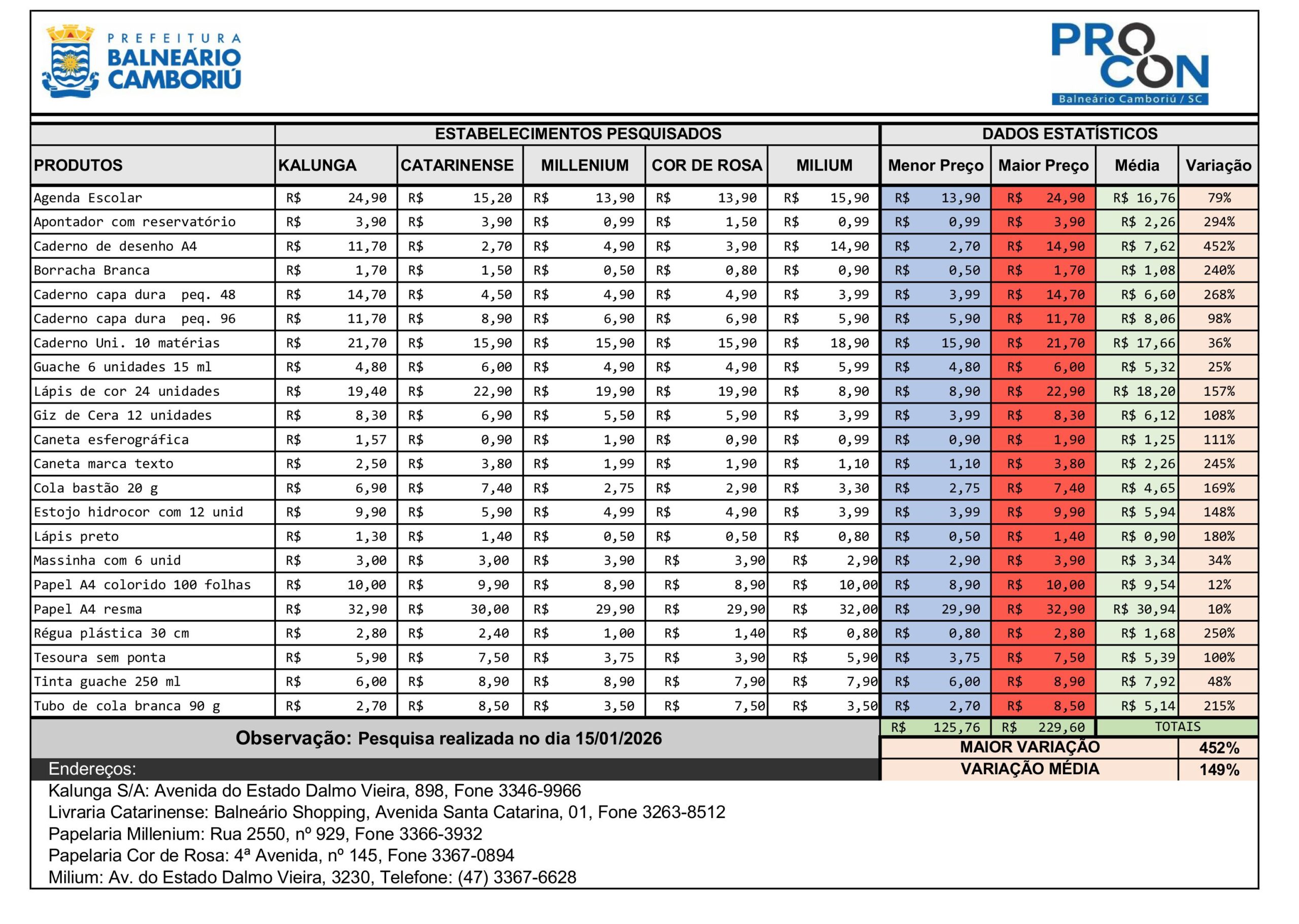 A pesquisa completa, incluindo os preços detalhados, nomes das papelarias e seus endereços, está disponível para consulta no anexo desta matéria.